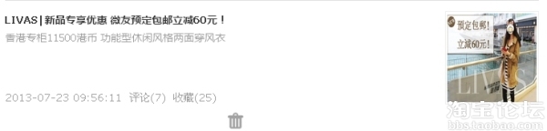 數據看過了,再看下面的微淘情況。這是在23號當天推送的微淘信息,收藏25.評論7.(這里說下,因為微淘目前不支持定時上架的寶貝連接。所以推送的消息只有圖片沒有連接。不過在最下面可以加連接。)