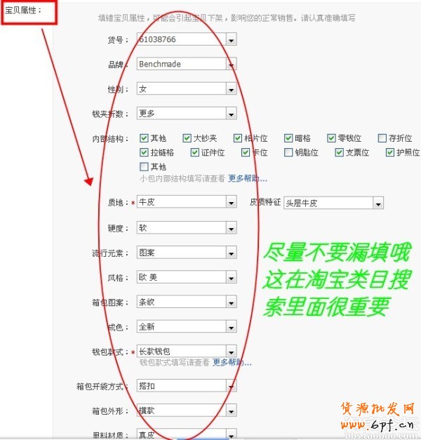 7.發布寶貝的時候一定不要放錯類目哦。放錯可能什么流量也不可能帶來。那怎么看看自己應該放哪個類目呢?我們進入shu.taobao.com,登入以后,輸入你賣的寶貝,例如,錢包就寫錢包。點出來里面有個“市場分析”出來以后,最高的那個柱子對應的類目就是我們應該放的類目 其實還可以用直通車來尋找正確的類目。還有就是屬性相關,在您發布寶貝的時候要將屬性欄能填的都填上,不要漏什么不要填: