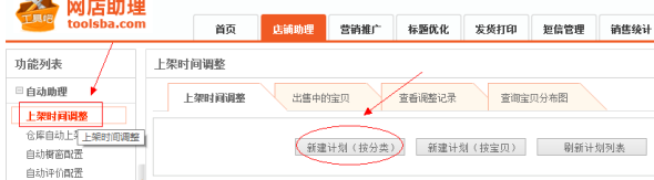 工具吧網店助理有一個叫上架時間調整的功能,我們點開上架時間調整后,最好是點擊新建計劃(按分類)。如下圖: