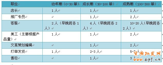 1.推廣:站內推廣人員1名、站外推廣人員1名,分別負責淘寶站內和站外的流量監測和投放,同時,負責競爭對手投放資源監測;
