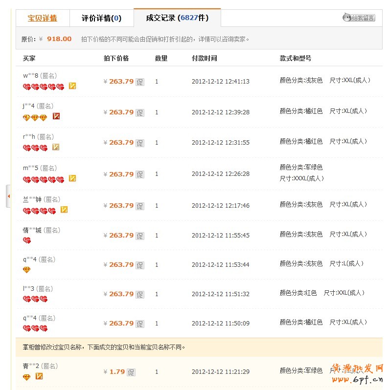 【瘋狂的搶購】2012年12月12日早上10:00,公司的前端小張一聲驚叫:“阿迪達斯羽絨服1.79元包郵!我買了10件!”,太便宜了!太勁爆了!其他同事要求他趕緊發鏈接,在公司QQ群里飛速點開鏈接直接進去購買,付款,生怕點慢了被其他人搶光了,然后滿臉通紅的一個個興奮的報戰果“我拍了20件”、“我拍了100件”、“我拍了50件”……有個哥們更狠,直接拍了638件,他說支付寶里沒錢了,要不然還拍。我們拍完后還不過癮,主動幫這個商家營銷,瘋狂的把這個“喜事”轉到各種QQ群和旺旺群,然后又是引起一片嘩然,各種戰果紛紛而來……這個時候我再刷新了下頁面,我拍的時候才成交幾百件,短短幾分鐘成交3000多件了,成交量還在瘋長!