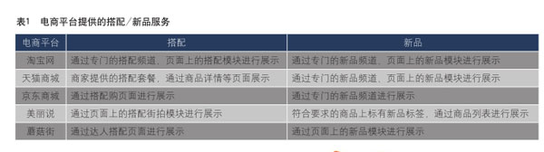 電商平臺以淘寶、天貓、京東為代表,資訊導購類平臺以美麗說、蘑菇街為代表,均嘗試提供針對性的功能或服務,例如搭配、新品功能、活動等,希望讓沒有明確商品目標的女性消費者逛得更爽,從而促進購買。關于搭配和新品的情況,具體如表1所示。