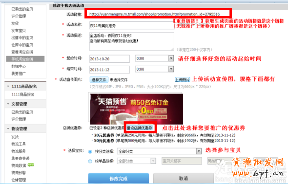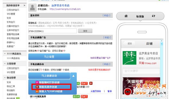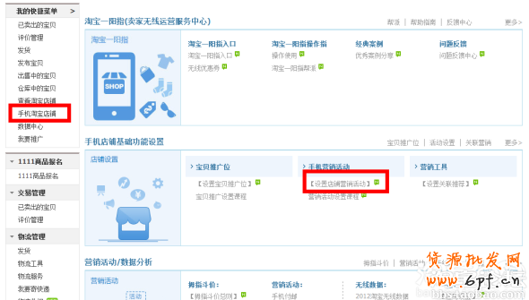 第三步:點擊PC店鋪后臺左側導航中的【手機淘寶店鋪】,再點擊【店鋪設置】里面的【設置店鋪營銷活動】