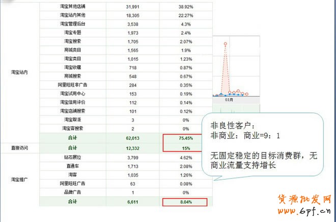 依轉化率的高低對流量來源進行排序,依次是活動流量(部分活動如聚劃算)丶直接訪問(老顧客或收藏)丶自然流量丶直通車流量丶硬廣流量;淘寶客流量轉化率也特別高,但因存在15天的積累效果,沒列入排名。大家可以根據店鋪的實際情況,選擇各自的重點流量來源。