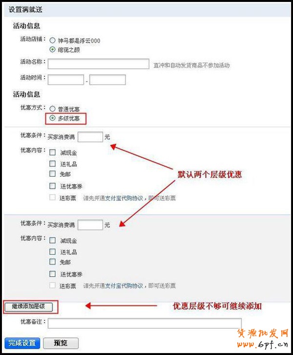 4、根據提示往下設置,可根據需求,設置多階梯促銷活動。多級優惠—最多可同時設置5個不同的主題活動,促銷方式更多樣化。活動設置完成后,點擊預覽、完成設置。