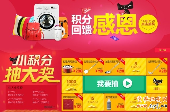 3) 用戶中積分獎品后,由系統自動發放到該用戶積分賬戶,中實物獎品后需要以1個天貓積分拍下中獎的商品,成功付款后由提供實物獎品的商家安排發放。