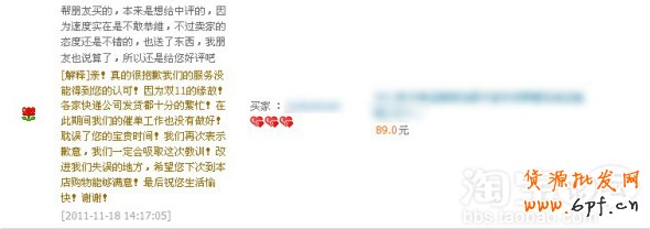 第五點:對于新手買家!第一次網購都會十分緊張,這是新手的慣病,比如:擔心受騙,衣服質量不好,怎么還收不到?等等很多細節問題。剛開始交易的時候,除了要詳細的和新手講明寶貝情況的同時,也一定要和新手多講一些關于售后方面的知識,例如:我們店鋪支持的服務項目:7天無理由退貨,運費險,貨到付款等等,更重要的是讓新手知道他買到寶貝以后是有很多層服務保障的,增強新手們購物的信心,就算新手收到貨物不滿意,也不會出現焦急情況而做出不理智的事情!但是一旦遇到中差評!也切不可急躁!與新手買家發生爭執!這樣只會把事態升級,卻解決不了問題。千萬不能店大欺客啊!我們一定要心平氣和的和新手買家談談!畢竟他們也不是惡意的不是!相信事情肯定會很好解決的!具體談話方法可以參考第四條!