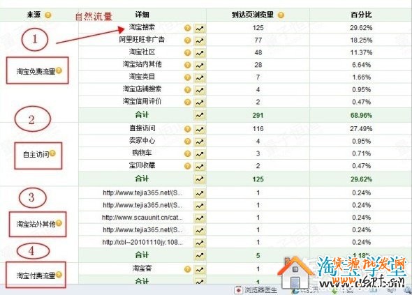 上圖很直觀的看出淘寶流量的構成,有4點。我想說的是,這些流量當中,要好好把握淘寶的免費流量中的淘寶搜索流量,也就是自然流量,因為這類流量比起其他流量來說是的最有效的,最有價值的流量,站外流量很多是幫你到處發廣告位,這些廣告都不是在相關專門的商業平臺投放,這樣來說,流量多少是會有提高,但是大多是垃圾流量,打個比方,你說在招聘網投放廣告有效嗎?招聘網人家是用來找工作的,誰還會管你的廣告。很多是不小心點進來的,這一類站外流量就是垃圾流量。(當然肯定有比較專業的廣告投放平臺,只是目前還沒了解到位)