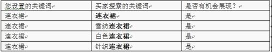 A)您設(shè)置的淘寶直通車關(guān)鍵詞是[連衣裙](精確匹配方式)時,只有買家搜索連衣裙的時候,您的推廣可以得到展現(xiàn)的機(jī)會,若買家搜索的是雪紡連衣裙、裙子,等時,您的推廣因為不是完全相同(或者是同義詞)了,則不會有展現(xiàn)的機(jī)會。