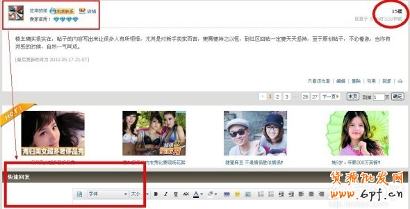 三,搶‘沙發(fā)’。所謂‘沙發(fā)’,就是第一個(gè)回帖的人,即直接搶到帖子的2樓回復(fù),為什么要搶‘沙發(fā)’,哈哈,當(dāng)然也是為了讓更多的人看見你,因?yàn)橐黄恼聻g覽下來第一眼進(jìn)入視線的就是‘沙發(fā)’啦,這可是一個(gè)曝光的機(jī)會(huì)呢(要看你如何利用了),還有下面的‘板凳’‘地板’地理位置也是相當(dāng)搶手的!新手們,這就要看看你們的速度啦!在這里,我在提供一個(gè)小小的竅門,如果‘沙發(fā)’‘板凳’‘地板’都搶不到,還有一個(gè)方法能讓你曝光,就是帖子第一頁的15樓!仔細(xì)看看下圖,15樓的位置絲毫不壓于‘沙發(fā)’,因?yàn)槲覀兓貜?fù)帖子的時(shí)候映如眼簾的就只有全世界唯一的你(15樓)!