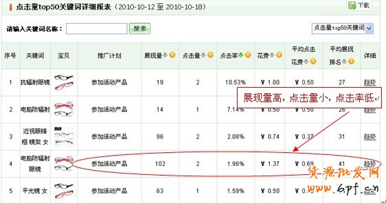 打開推廣效果-直通車基礎(chǔ)數(shù)據(jù)-寶貝報表-點擊量top50寶貝詳細(xì)報表,選出寶貝下面展現(xiàn)量為零的關(guān)鍵詞。