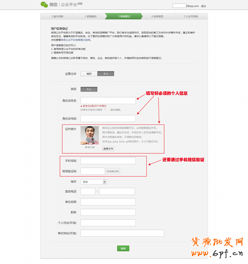 第三步:目前微信審核流程比較嚴(yán)格。當(dāng)在郵箱點擊微信公眾賬號的激活鏈接后會自動跳轉(zhuǎn)到微信公眾賬號的個人信息登記頁面。這時候你需要按照要求填寫個人信息,還要上傳一張持有身份證的照片;另外還要通過手機短信驗證,相當(dāng)于要綁定個人的手機號碼,這一步驟希望讀者謹(jǐn)慎點啦!