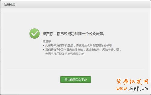 恭喜你!你就已經(jīng)創(chuàng)建好一個微信的公眾賬號了。不過微信人需要經(jīng)過審核才算正式開通,微信會在7個工作日內(nèi)幫你完成審核。也就是說你的微信公眾賬號有可能無法審核通過,所以剛才的填寫公眾賬號信息就需要認真填寫了。