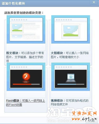 創建以后,會有下面四種模塊供我們選擇,這里我們為的是加入淘寶店鋪的寶貝圖片,所以我們只選用大圖模塊,如果您想讓自己空間更加生動,可選擇flash動態模塊!
