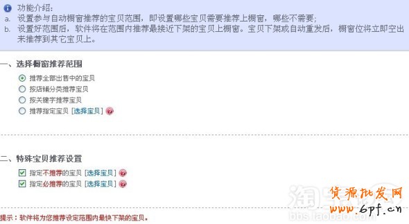 其實這個沒太多可說的,很多前輩都已經總結得很好了,再多說就是老生長談了。櫥窗功能是淘寶贈送給我們的,不用白不用,你要知道在相同條件下有櫥窗推薦的寶貝搜索排名要比沒有櫥窗推薦的寶貝要高很多哦。當然要推薦的寶貝的原則應該是越快下架的越優先。這個可以使用軟件來設置自動推薦就好了,淘店長自動櫥窗推薦這軟件還可以。