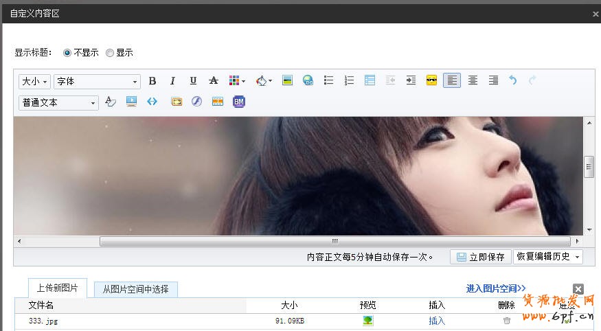 第十二步:在裝修后臺“頁面管理”中,最頂部創建一個自定義模塊,然后將這個前景圖像上傳到自定義區,入下圖所示。