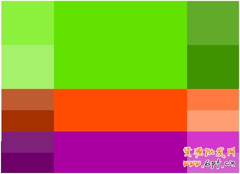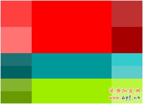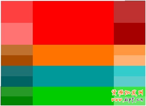 這是紅色和綠色的色調(diào)經(jīng)過(guò)不同純度、明度調(diào)試后所得配色方案。這個(gè)對(duì)比度很強(qiáng),運(yùn)用時(shí)不宜同時(shí)大范圍使用。