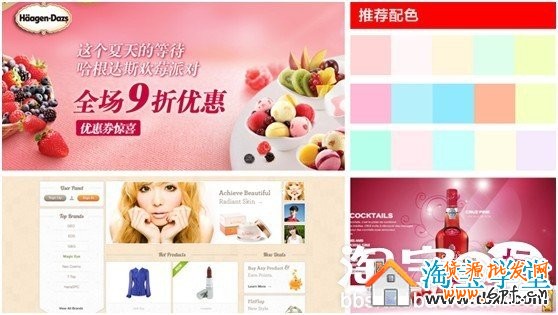 各種顯眼的顏色加入白色后,便會(huì)調(diào)和出很多柔和的粉色,常見的有粉紅、粉黃、粉藍(lán)等等。這些顏色往往會(huì)給消費(fèi)者一種清爽、浪漫、嬌美、舒適的感覺。以清新粉為例,配色時(shí)建議搭配黑色、白色以及各種粉色。