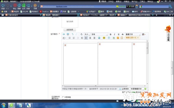 打開后鼠標(biāo)單擊內(nèi)容區(qū),然后按Ctrl+A全部選中,再按Ctrl+C復(fù)制全部,在編輯之前先重新發(fā)布一個寶貝,發(fā)布這個寶貝其他項都可以不填,只填必選項就行了,為什么要這樣做呢?因為我們現(xiàn)在所進行的都是HTML代碼的編輯,為了不出錯,操作方便這樣是最省事的辦法,