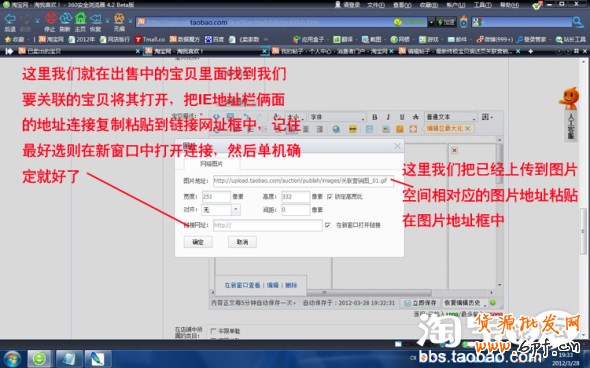剩下的關(guān)聯(lián)寶貝操作得方法一樣,按照上面的方法依次把要做好的關(guān)聯(lián)做好后,再點擊左上角的源碼按鈕,進入源碼編輯模式,這個時候?qū)氊惷枋鼍庉嬁蛑谐霈F(xiàn)的所有代碼就是我們所編輯的關(guān)聯(lián)圖形的代碼,鼠標(biāo)單擊編輯框內(nèi),然后按Ctrl+A全部選中,再按Ctrl+C全部復(fù)制到剪貼板,然后就不要把這個上架的寶貝上架,只要放入倉庫就行!因為復(fù)制在剪貼板里面的代碼可能在操作得過程中我們會丟失,當(dāng)剪貼板中的內(nèi)容丟失后我們可以進入倉庫中的寶貝,找到這個寶貝點擊編輯寶貝,就可以重新進入寶貝描述頁中復(fù)制代碼!