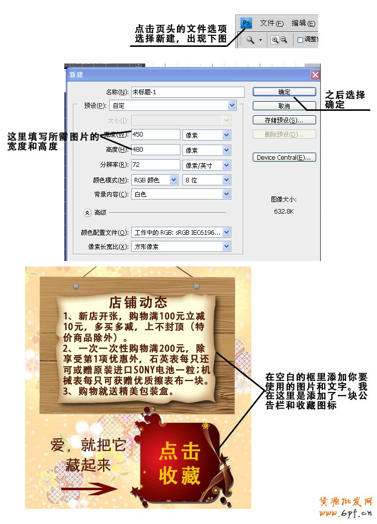 因為我之前選擇的FLASH模板是寬300X高480的,所以我們要新建一個寬450x高480的圖片(標準版旺鋪的自定義頁面默認是750寬,那么用750-300=450,為了兩部分能完美得貼合在一起所以我們的尺寸要計算好。這里使用的單位是像素)