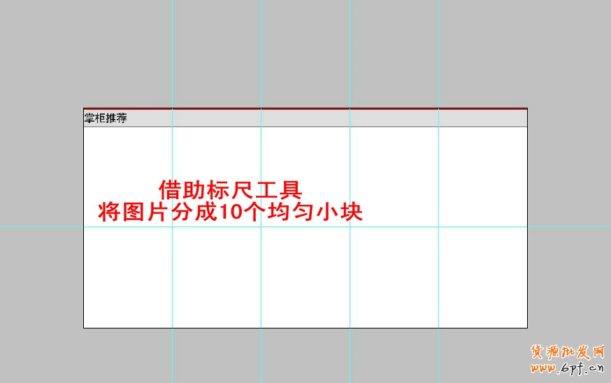 這樣基本的樣子就出來了。接下來我們對圖片進行分割,分成2行5列,10個均勻的小塊。為什么是5列呢?大家想,圖片的寬度是950px,而標準版旺鋪左側自定義模板的寬度是190px。這樣剛好分成5等分。 接下來 我們按Ctrl + R 打開PS的標尺工具。然后點擊視圖——新建參考線 建立六條參考線