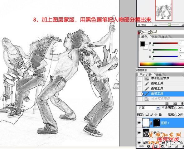 步驟七、八,新建一個圖層,填充白色,加上圖層蒙版,用黑色畫筆把人物部分擦出來,確定后合并所有圖層,完成最終的效果。這樣做的目的是為了去除圖像不必要的背景。