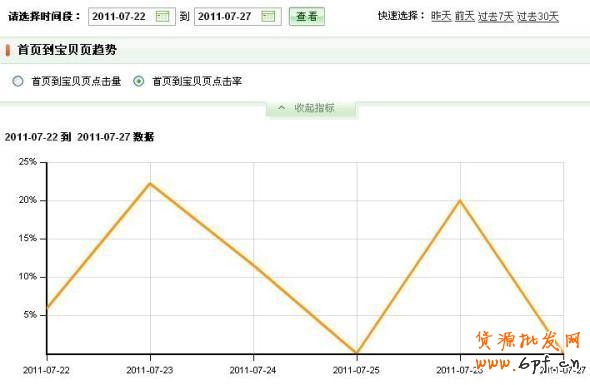 從上圖顯示的7.22~~7.27 一周首頁到寶貝頁點擊率在0~20%波動,呈起伏不定狀態。