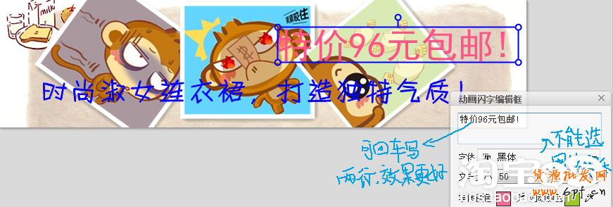 我們先加入靜態(tài)的寶貝描述的字樣,靜態(tài)文字可以選擇流行的網(wǎng)絡(luò)文字,很好看哦!點(diǎn)擊上圖左邊顯示的輸入靜態(tài)文字就會出現(xiàn)編輯框進(jìn)行編輯