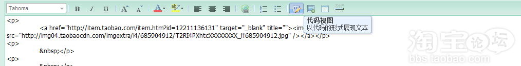 然后點(diǎn)擊工具欄左上角第一個按鈕,也就是“源碼”按鈕,進(jìn)入到以代碼形式 展現(xiàn)寶貝描述的頁面,選擇剛加入的描述相對應(yīng)的代碼,并復(fù)制它們。