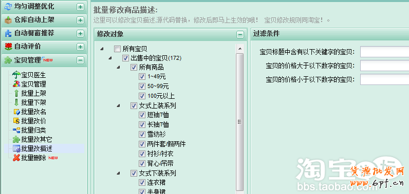 這里選擇需要修改的商品,系統(tǒng)默認(rèn)是所有出售中的寶貝哦,右邊有篩選過濾條件,很方便,選好之后點(diǎn)擊下方的下一步