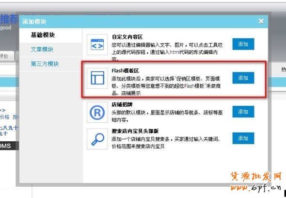 NO.3、添加flash促銷模塊進(jìn)入“店鋪裝修”-在對應(yīng)的位置點擊“在此處添加新模塊”進(jìn)入模塊添加頁面選擇“falsh模板區(qū)”如下圖