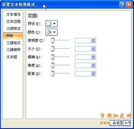 繼續(xù)在設(shè)置文本效果格式對話框中選擇陰影,并在透視中選擇一個(gè)和三維旋轉(zhuǎn)同方向的陰影樣式