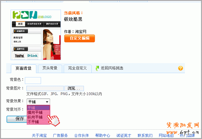 4)不平鋪:指的是一個背景圖片,它本身有多大,上傳后就是多大,上下左右均不延伸!