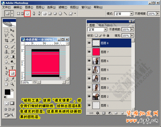 7.“矩形工具”使用“填充像素”,結(jié)合我們做好的輔助線,繪制出圖層8黑色填充圖層,這是用來烘托動畫效果的圖形層。
