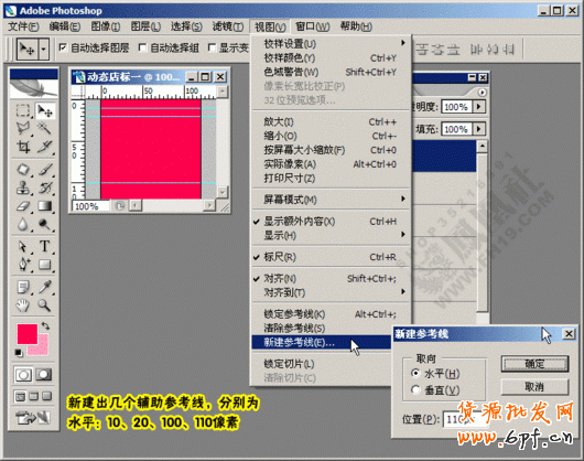 6.先建出幾個輔助參考線,分別為水平:10 20 100 110像素。