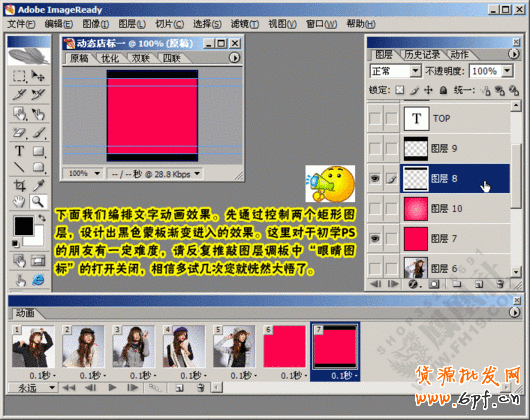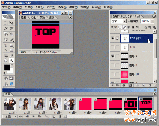 12.ImageReady是PS 捆綁軟件,界面大同小異,使用簡單,點“窗口”菜單調(diào)出“動畫”調(diào)板。配合圖層的顯示和隱藏,我們就能設(shè)計出漂亮的動畫。