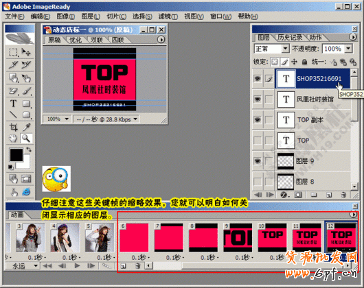 4.F7調(diào)出圖層調(diào)板,我們得到了一個多張照片重疊在以前的多圖層文件。PS:設(shè)計制作動態(tài)網(wǎng)店店標(biāo),主要就是配合圖層使用PS捆綁的軟件ImageReady完成的。因此圖層調(diào)板的使用就是核心技巧。