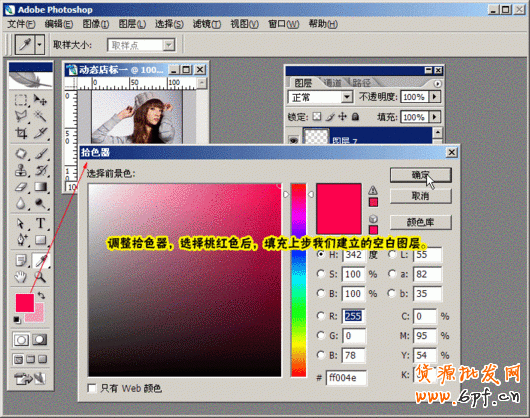 5.調(diào)整拾色器,選擇桃紅色后,填充上步我們建立的空白圖層。