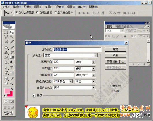 好了!看完動態(tài)店標(biāo)實例,我們接下來開始設(shè)計制作動態(tài)網(wǎng)店店標(biāo)了。掌柜們都知道淘寶旺旺頭像是120*120,店標(biāo)是100*100像素的,這里我們以頭像為示例,啟動PS2軟件先建一個120*120的文檔。
