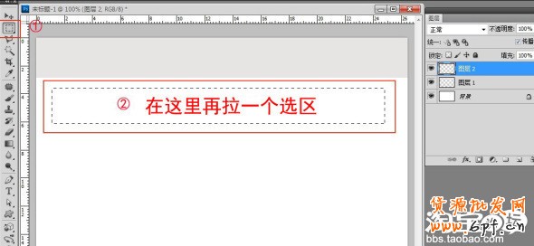 下一步,再點(diǎn)擊新建圖層按鈕新建一個(gè)圖層2,利用前面講過的矩形工具在文件下的下方再拉一個(gè)選區(qū)出來.