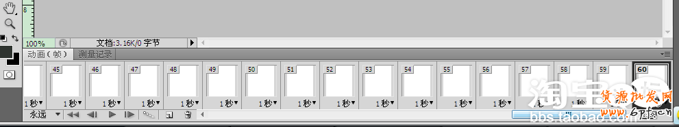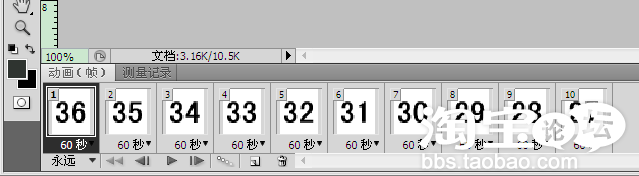 好了,60個幀都建好了,接下來就是最麻煩的事情了,我們要在每一個幀上輸入一個數(shù)字,那就是從59到00的數(shù)字,我們現(xiàn)在第一幀上輸入數(shù)字59,然后在第二幀輸入58,當(dāng)我們點(diǎn)擊第二幀的時候,我們會發(fā)現(xiàn),后面所有的幀都有59這個數(shù)字,沒關(guān)系,我們只要通過圖層面板對圖層的可視性進(jìn)行調(diào)節(jié)就可了,使每個圖層顯示他應(yīng)該顯示的數(shù)字既可以,像這樣以此類推,輸?shù)阶詈笠粠?0,輸完之后我們還要對所以幀上的數(shù)字進(jìn)行適當(dāng)?shù)恼{(diào)整,使它們都在不同圖層的同一個位置,這樣當(dāng)?shù)褂嫊r的時候圖片看起來才不會亂跳。
