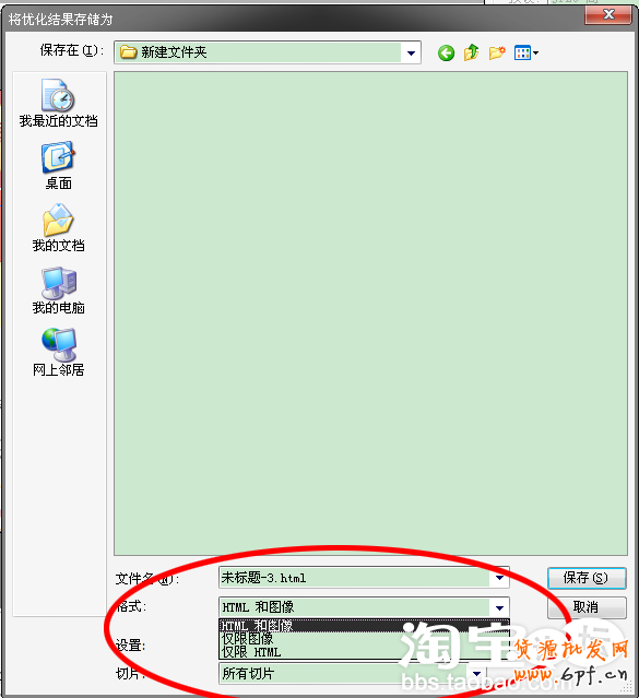 調(diào)整好之后我們就可以保存了,在保存的時候我們要注意下,因?yàn)槲覀円牟粌H僅是圖片,而是圖片和html文件兩者都要,所以在保存的時候我們要在格式處選擇HTML和圖像,然后點(diǎn)擊保存