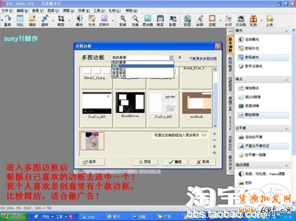 在編輯界面里面打開上欄右上角的邊框---選多圖邊框---然后在中間選創意,(我個人比較喜歡這個里面的一款多圖邊框,它比較簡潔,可以放三張圖片,而且這個邊框沒有多余的花式跟文字,適合很多的產品)比較推薦哦!
