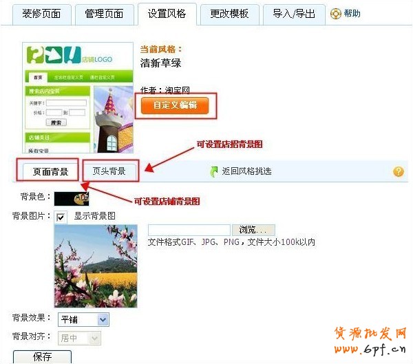 登錄“我的淘寶”—“我是賣家”—“店鋪管理”—“店鋪裝修”—“設(shè)置風(fēng)格”—“自定義編輯”即可設(shè)置頁面背景和頁頭背景,頁面背景設(shè)置如下圖: