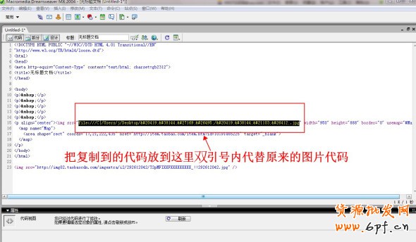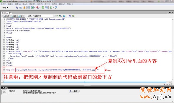 復制好空間圖片代碼后就讓我們再次回到Dreamweaver軟件代碼界面吧。把從圖片空間獲取的代碼粘貼到代碼窗口的底部空白處(為了方便得到圖片的代碼),然后復制雙引號里面的代碼,注意看下面圖示的紅色文字哦: