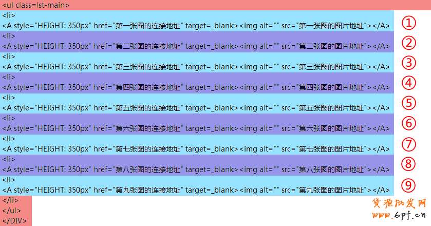 ⒊ 藍(lán)色與紫色部分—— 不難看出,以上顯示的代碼一旦運(yùn)用起來,就完成了7張圖片輪播,很顯然已經(jīng)實(shí)現(xiàn)了突破5張約束目的