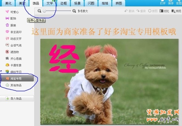 現(xiàn)在我們假設有一件商品是最新款,而且在最近的銷售量也很不錯,我們也想推薦給來到怎么店里的顧客,但是你想過沒有,店里那么多圖片,如何能吸引顧客的眼球是關鍵,問題來了,就是讓我們把圖片制作的獨具一格才行!那我們就開始吧,具體步驟如下:打開一張圖片,點下飾品,然后再點淘寶專用,如圖