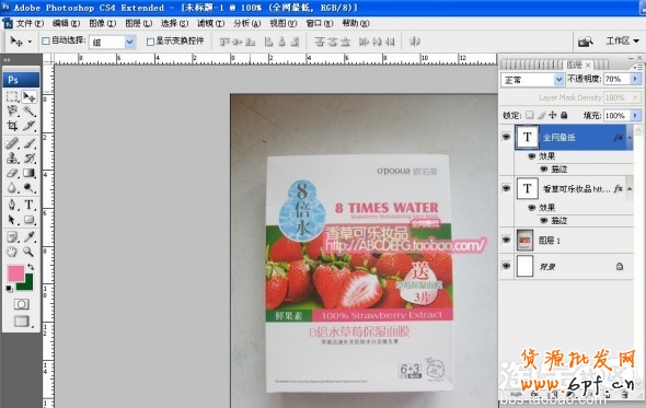【窗口】——【圖層】——選中文字圖層。2個圖層不透明度都改為70%。【透明度可根據產品情況自調百分比】這樣會隱約透出產品的圖案。