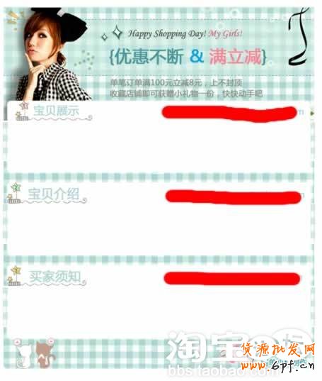 今天寫的這篇帖子是教大家怎么做描述模板的,個人覺得一個簡單實用的描述模板會比首頁更重要,因為每當顧客搜索的寶貝的時候,點擊之后看到的是寶貝頁面而不是首頁,所以我們應該重視寶貝描述的裝修和宣傳,這樣才可以為我們帶來更多的顧客哦!話不多說,先上教程的例子,紅線部分為抹掉的網址,要避免廣告嫌疑嘛!!